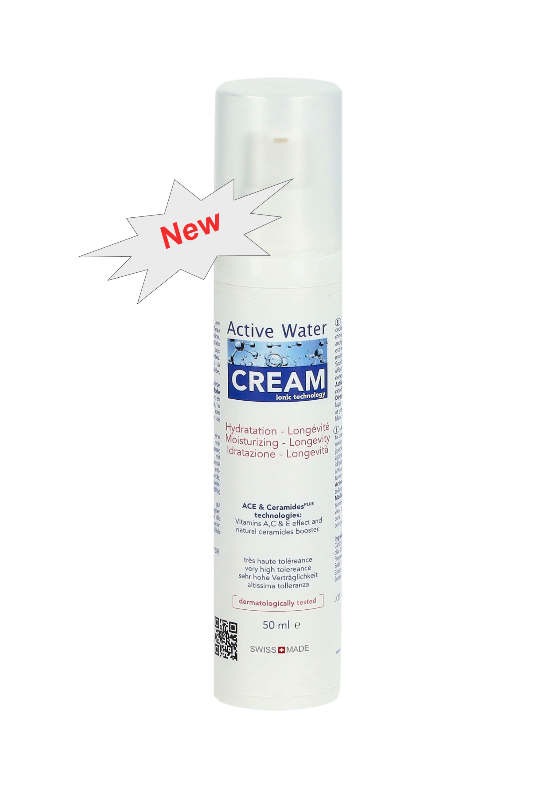 Novità. Active Water Cream è un rivoluzionario prodotto per la cura del viso a base di acqua mineralizzata e ionizzata, olio di jojoba, arricchito con estratto di stella alpina e acido hyluronico. Il nuovo concetto Skin Cellular Interaction di Active Water Cream si concentra sulle interazioni cellulari con i principi attivi nella loro espressione più pura, senza l’aggiunta di prodotti chimici o controversi come tensioattivi, emulsionanti, conservanti, stabilizzatori, ecc. Grazie alla tecnologia Advanced Water S-100 e ai suoi ioni negativi, Active Water Cream promuove l’interazione ionica diffondendo le sue strutture molecolari uniche attraverso la pelle. La sua innovativa tecnologia ACE & Ceramide PLUS favorisce la formazione naturale di ceramidi con effetto vitamine A, C ed E. Active Water Cream rispetta il pH naturale della pelle, è idratante, antiossidante (longevità) e rinforza la barriera cutanea. La pelle è accuratamente rigenerata, nutrita e luminosa.